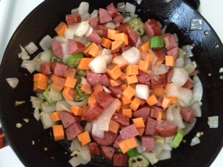 Saute chopped onions, garlic, and 1 cup of sliced okra.