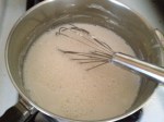 We had been storing it in the garage. Todd stepped in at this point cutting one-quarter of the pumpkin up into cubes and simmering it on the stove top for about ninety minutes. From the sofa reading I watched as he drained off cooked pumpkin and set aside leaving the lovely orange broth in the pan. He added 2 tablespoons of butter to a small metal dish …floated it on top the broth for a couple of minutes, and dangerously pulled it with his bare hands added 2 tablespoons of flour to the butter and made a roux.